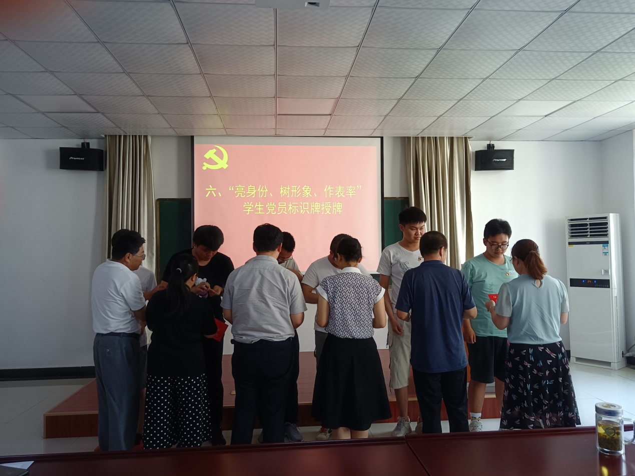 新党员代表汪博文、老党员代表韩新亚分别发言,先后分享了加入中国共产党的激动心情,表达作为一名共产党员的荣誉以及为共产主义事业奋斗终生的信心和决心。老党员还为新党员佩戴党员徽章并进行学生党员标识牌授牌。