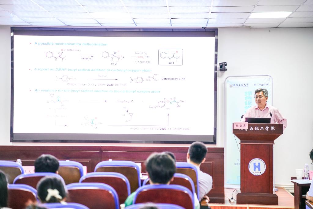 大会报告会环节,汪义丰教授作了主题为“硼自由基介导的碳-杂键选择性活化研究”的报告。报告介绍当今硼自由基介导反应最新国际前沿和最新研究成果,内容深入浅出、严谨生动,拓宽了师生的学术视野,获得了师生的强烈反响。