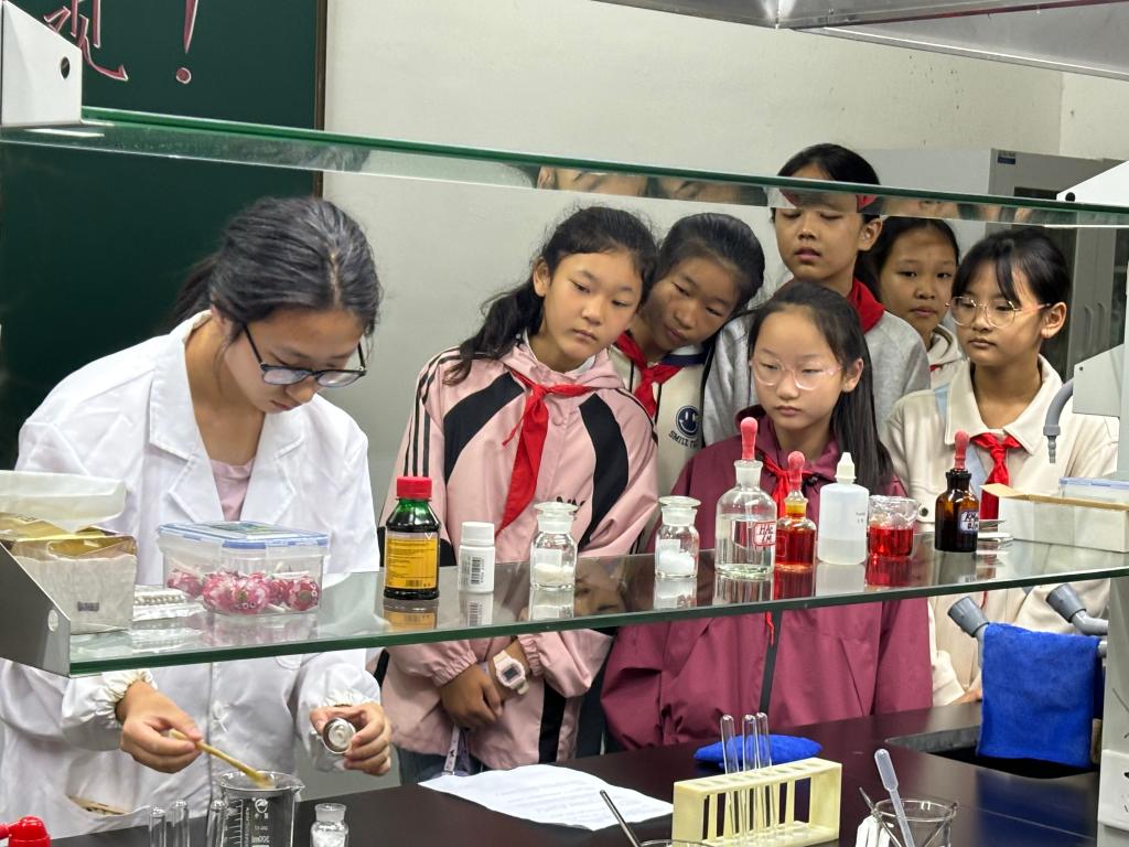 活动期间,同学们分批走进我校秀山校区安徽省科普教育基地以及佳山校区的化学基础实验室。在实验室老师和大学生志愿者的悉心指导下,孩子们亲身体验了一系列趣味盎然的物理、化学科普小实验。从色彩变幻的化学反应到奇妙有趣的物理现象,实验室里充满了同学们的惊叹与欢声笑语。这些“看得见、摸得着”的科学体验,将课本上抽象的知识化为生动的实践,极大地调动了孩子们探索未知世界的积极性。