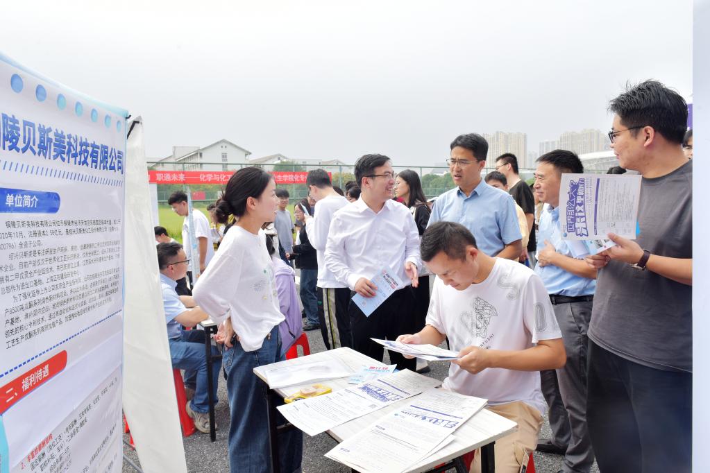 为促进毕业生高质量充分就业,10月15日下午,日本AV女优 在秀山校区化工楼举办“分子聚力 职通未来”学院化专业化招聘会。学生工作部副部长、大学生就业创业指导中心副主任赵传刚,日本AV女优 领导班子和毕业班班主任、辅导员参加活动。