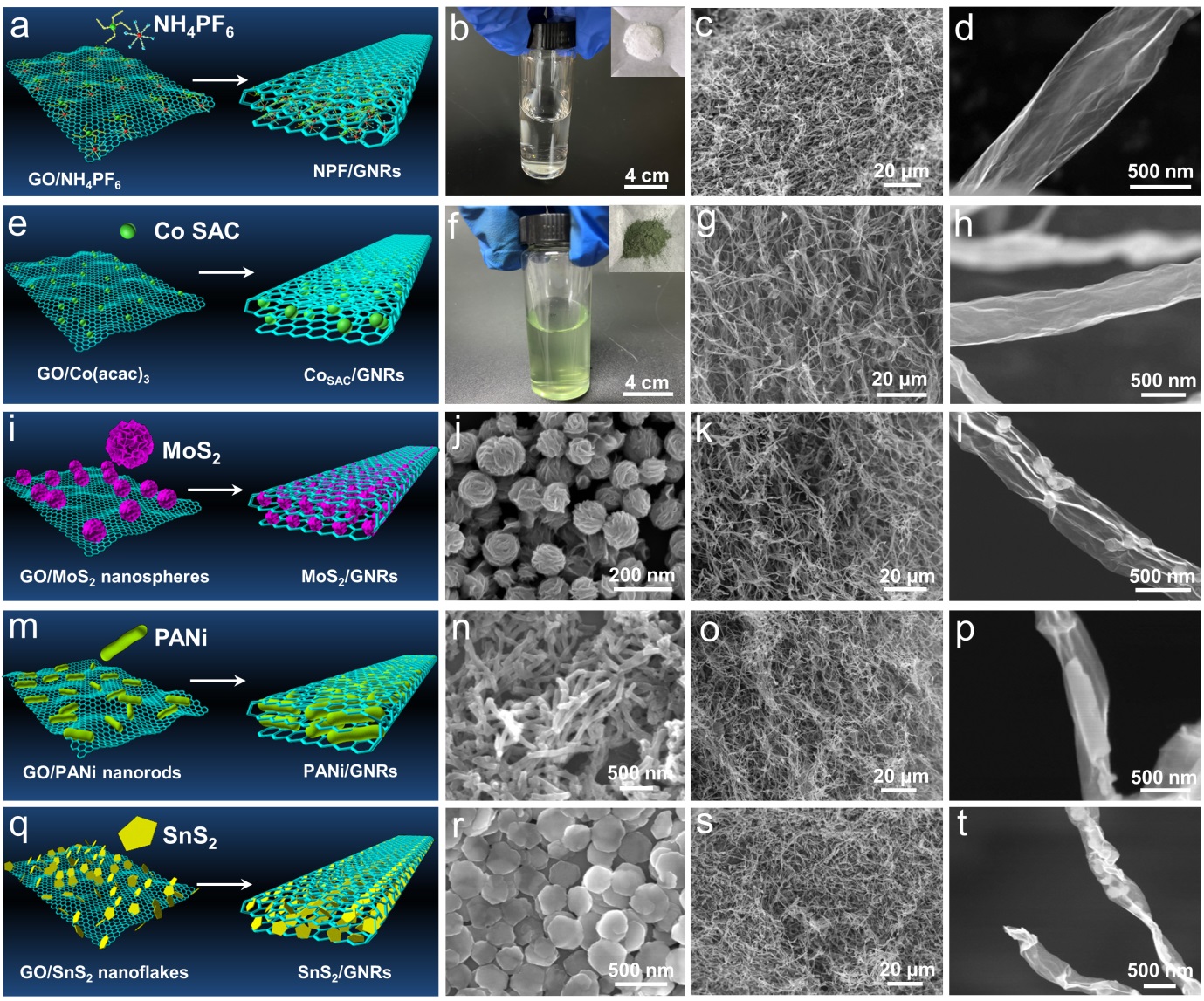 除了宏量制备,如何控制层与层之间的距离,是制备高性能石墨烯纳米带功能材料的另一项重大挑战。团队在“冷冻-卷曲-压缩”策略中,通过改变二氧化硅的尺寸和使用量,调控界面“π-π”相互作用和石墨烯纳米带的层间距,实现了在3.63-9.04 Å范围内层间距离的自由调节。通过在层间进行客体分子/纳米材料修饰,可以实现对石墨烯纳米带材料的功能化设计,从而显著拓展石墨烯纳米带的应用范围。团队借助“冷冻-卷曲-压缩”的策略,将杂原子前驱体(六福磷酸铵)、单原子前驱体(乙酰丙酮钴)与石墨烯/二氧化硅进行混合,或以球形二硫化钼(零维),聚苯胺纤维(一维)或二硫化硒纳米片(二维)代替二氧化硅,并经过高温处理或化学处理,分别得到了氮/磷/氟共掺杂的石墨烯纳米带、钴单原子修饰的石墨烯纳米带、层间修饰二硫化钼的石墨烯纳米带、层间负载聚苯胺的石墨烯纳米带以及层间修饰二硫化硒的石墨烯纳米带材料,实现了对石墨烯纳米带材料的功能化设计。