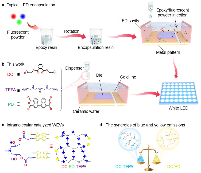 本研究提出了一个新的概念,将具有白光发射的分子内催化交联聚合物用于WLED封装,在一个聚合物体系中同时实现光致发光、动态共价键化学和内催化等特性,创新发展了一种可发光和可回收的双重功能封装材料,既避免了使用无机荧光粉,又可同时通过分子内催化实现封装材料再加工回收。由于合成的简易性和易加工的特点,这种新的发光材料具有广阔的应用前景,为封装365 nm LED芯片提供了一种崭新的思路,将引领LED器件关键技术的发展。