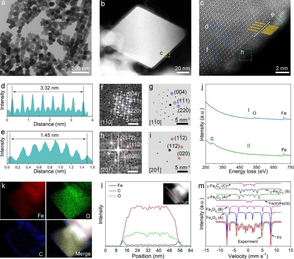 (图1. 暴露{202}晶面的Fe3O4@χ-Fe5C2纳米立方体的结构表征)