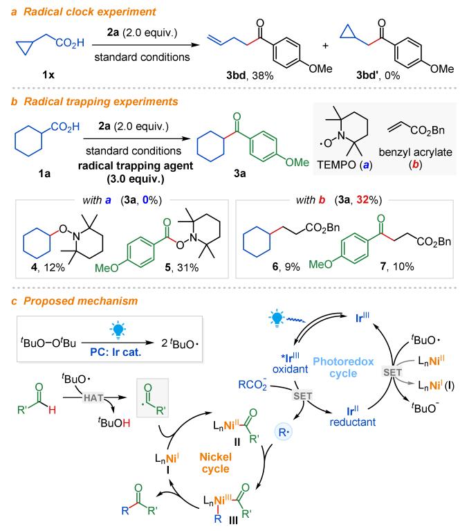 团队创造性地使用叔丁基过氧化物作为氧化剂和氢原子转移试剂,将烷基羧酸盐的单电子氧化脱羧和醛的氢原子转移有机结合起来,通过镍催化的自由基-自由基交叉偶联,首次实现烷基羧酸与醛的直接脱羧交叉酰基偶联反应。该反应具有广泛的底物普适性,三氟甲氧基、酮、醚、酯、酰胺、氰基等官能团均能较好地兼容。此外,复杂分子的后期官能团转化和关键中间体的合成,进一步说明了该反应潜在的实用价值。机理研究表明该反应同时存在烷基自由基和酰基自由基;通过密度泛函理论(DFT)计算进一步说明镍催化的自由基-自由基交叉偶联优先发生Ni(I)物种对酰基自由基的单电子氧化加成。