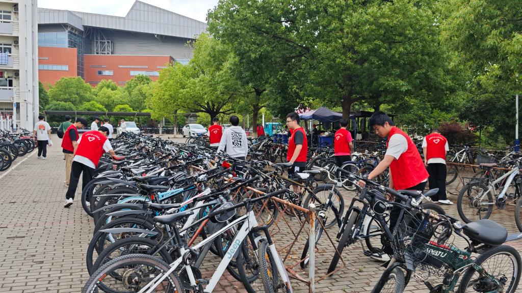 活动当天,师生志愿者分为自行车整理组和卫生清扫组展开行动。在后勤处老师的指导下,自行车整理组的同学将宿舍楼前随意停放的自行车逐一归位,按区域整齐摆放,并对车辆进行清洁维护,确保公共通道畅通无阻;卫生清扫组的同学手持扫帚等工具,对J栋宿舍楼周边道路、绿化带及公共区域进行细致清理。经过两小时的协作劳动,宿舍区环境焕然一新,公共空间秩序井然,有效提升了宿舍区的整洁度和安全性。