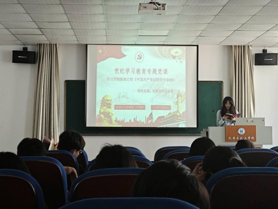 为深入学习贯彻习近平总书记关于党纪学习教育的重要讲话和重要指示精神,强化支部党员纪律意识和底线意识,提高责任担当。5月15日,化工学院应化专业本科生第一党支部以《学习贯彻新修订的<中国共产党纪律处分条例>》为主题,组织开展“纪检委员有话说”特色党课,由支部纪检委员为全体学生党员讲授党纪学习教育专题党课。