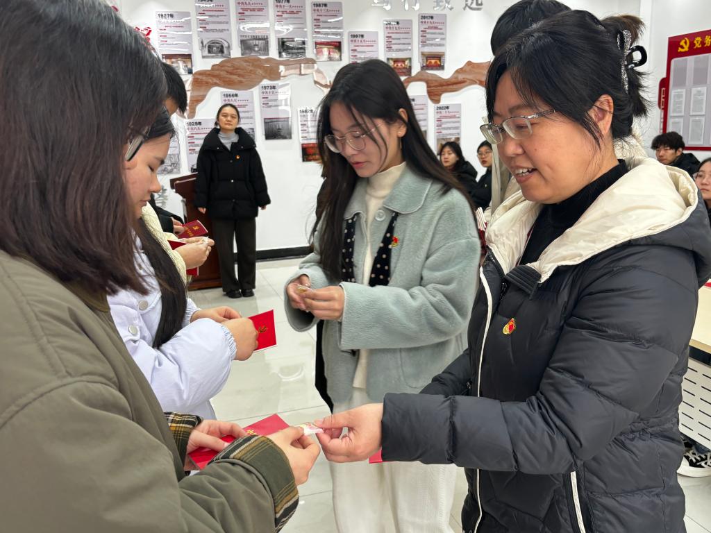 伴随着庄严的《国际歌》,入党宣誓仪式正式开始,冀秀芝宣读了学院党委关于新发展党员的批复。在庄严的党旗下,新发展党员们整齐列队,面向鲜红的党旗,佩戴党员徽章,握紧右拳,语气坚定、声音激昂地进行了庄严的宣誓。新党员们一字一句,铿锵有力,表达了他们对党的无限忠诚和为党的事业奋斗终身的坚定信念。学院领导及党员代表为每一位新发展党员佩戴了党徽,颁发了《中国共产党章程》。新党员代表谢婧和老党员代表杨雨婷分别做了发言,表达出作为一名学生党员,要时刻保持党员的先进性和先锋模范带头作用的决心和信心。