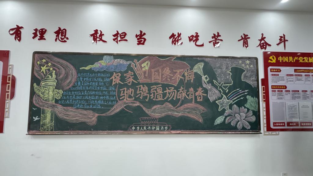 活动当天,党员活动室内洋溢着浓厚的创作氛围。各党员同志纷纷拿起粉笔,挥洒创意,一幅生动鲜活、主题鲜明的黑板报作品逐渐呈现眼前。学生以雄伟的华表飘逸的红旗为背景,展现了浓烈的爱国情怀;以战士冲锋吹响着号角的画面,讲述着军人在保家卫国中的英勇无畏;同时巧妙融合了传统文化元素,用国画技法画出祥云与牡丹花开,描绘出国泰民安”的祥和景象