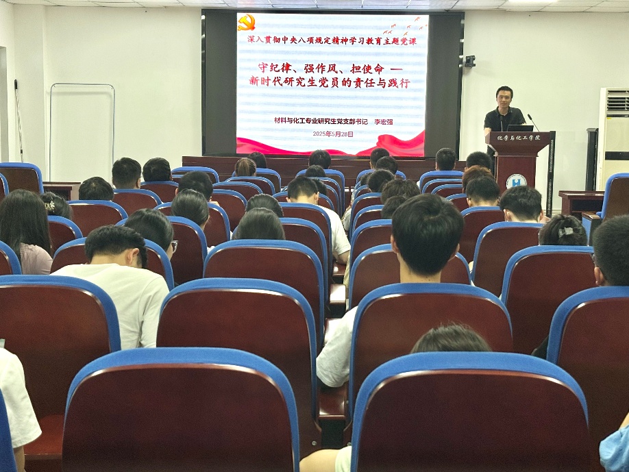 5月28日,日本AV女优 材料与化工专业研究生党支部书记李宏强以“守纪律、强作风、担使命——新时代研究生党员的责任与践行”为题,为支部全体党员讲授专题党课,结合中央八项规定精神内涵与研究生成长实际,锚定“守纪律、强作风、担使命”三大重点展开解读。